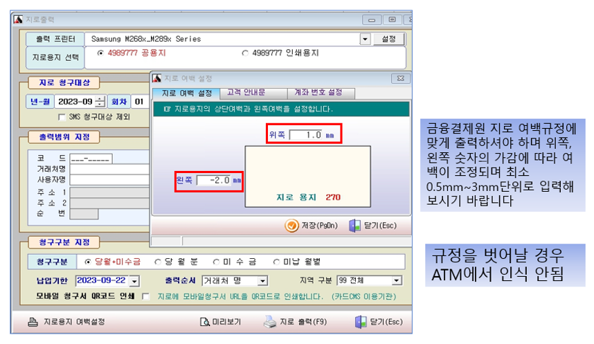 지로 출력 확인 및 여백 설정